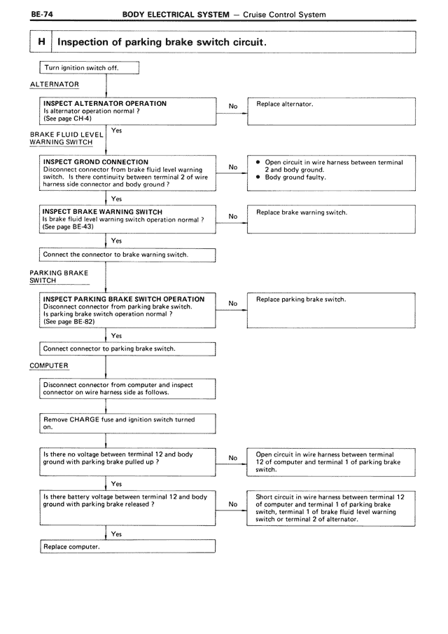 No → Short circuit in wire harness between terminal 12 of computer and terminal 1 of parking brake switch, terminal 1 of brake fluid level warning switch or terminal 2 of alternator.