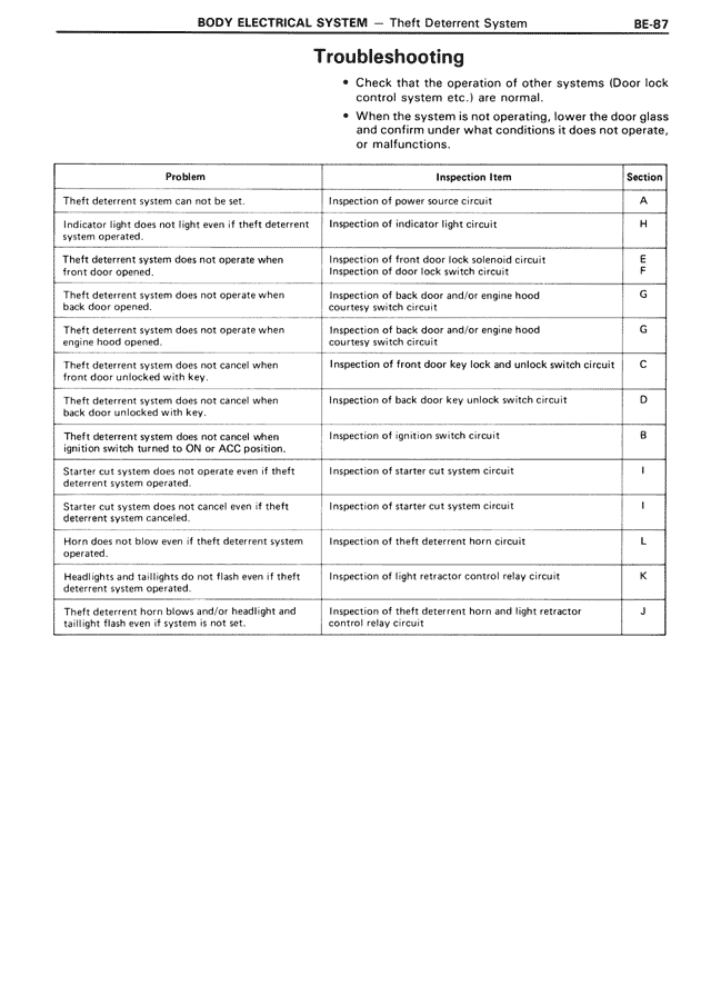 Theft deterrent system does not operate when back door opened. | Inspection of back door and/or engine hood courtesy switch circuit | G