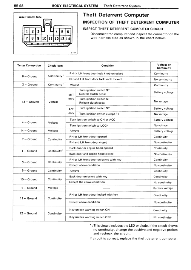 13 — Ground | Voltage | M/T only | Turn ignition switch ST | Battery voltage