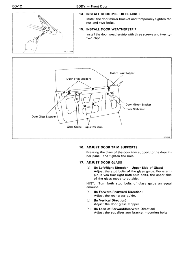 [THIS IS FIGURE: Detailed diagram of front door components showing Door Trim Support, Door Glass Stopper, Door Mirror Bracket, Inner Stabilizer, Glass Guide, Equalizer Arm, and Door Glass Stopper - BO1331]