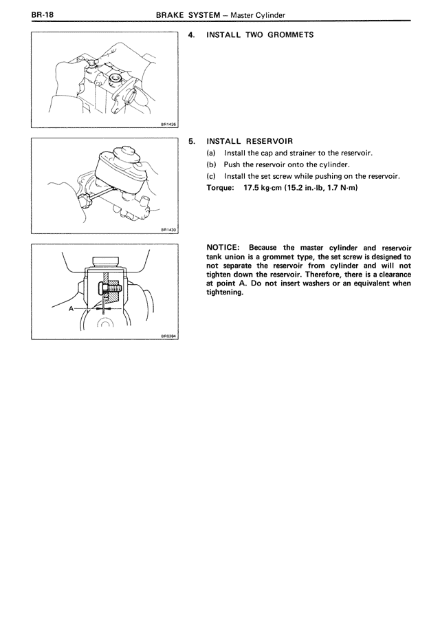 NOTICE: Because the master cylinder and reservoir tank union is a grommet type, the set screw is designed to not separate the reservoir from cylinder and will not tighten down the reservoir. Therefore, there is a clearance at point A. Do not insert washers or an equivalent when tightening.