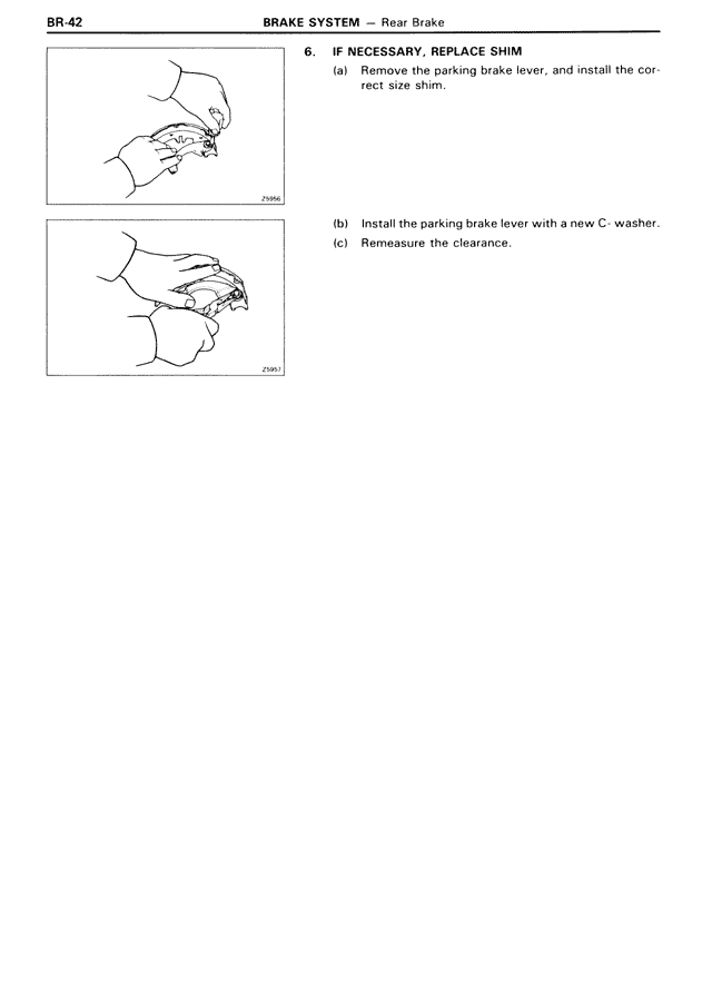 BR-42 BRAKE SYSTEM — Rear Brake 6. IF NECESSARY, REPLACE SHIM (a) Remove the parking brake lever, and install the correct size shim. (b) Install the parking brake lever with a new C- washer. (c) Remeasure the clearance.