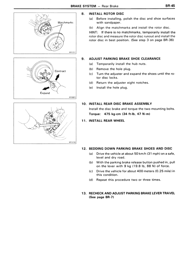 HINT: If there is no matchmarks, temporarily install the rotor disc and measure the rotor disc runout and install the rotor disc in best position. (See step 3 on page BR-36)