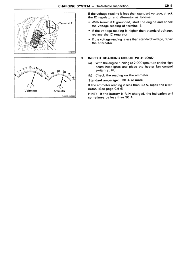 If the ammeter reading is less than 30 A, repair the alternator. (See page CH-6)