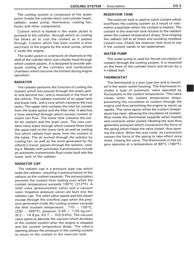 The radiator cap is a pressure type cap which seals the radiator, resulting in pressurization of the radiator as the coolant expands. The pressurization prevents the coolant from boiling even when the coolant temperature exceeds 100°C (212°F). A relief valve (pressurization valve) and a vacuum valve (negative pressure valve) are built into the radiator cap. The relief valve opens and lets steam escape through the overflow pipe when the pressure generated inside the cooling system exceeds the limit (coolant temperature: 110 ~ 120°C, pressure: 0.9 ~ 1.1 kg/cm², 12.8 ~ 15.6 psi (9.2 ~ 14.9 psi, 63.7 ~ 103.0 kPa). The vacuum valve opens to alleviate the vacuum which develops in the coolant system after the engine is stopped and the coolant temperature drops. The valve's opening allows the pressure in the cooling system to return to the coolant in the reservoir tank.