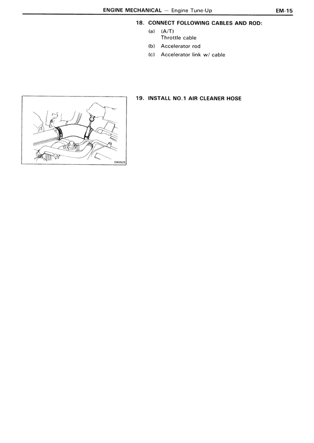 18. CONNECT FOLLOWING CABLES AND ROD: (a) (A/T) Throttle cable (b) Accelerator rod (c) Accelerator link w/ cable 19. INSTALL NO.1 AIR CLEANER HOSE