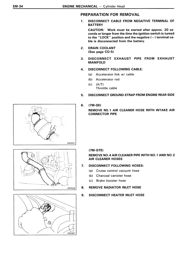 CAUTION: Work must be started after approx. 20 seconds or longer from the time the ignition switch is turned to the "LOCK" position and the negative (—) terminal cable is disconnected from the battery.