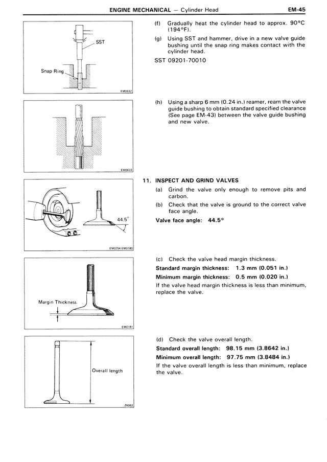 (h) Using a sharp 6 mm (0.24 in.) reamer, ream the valve guide bushing to obtain standard specified clearance (See page EM-43) between the valve guide bushing and new valve.