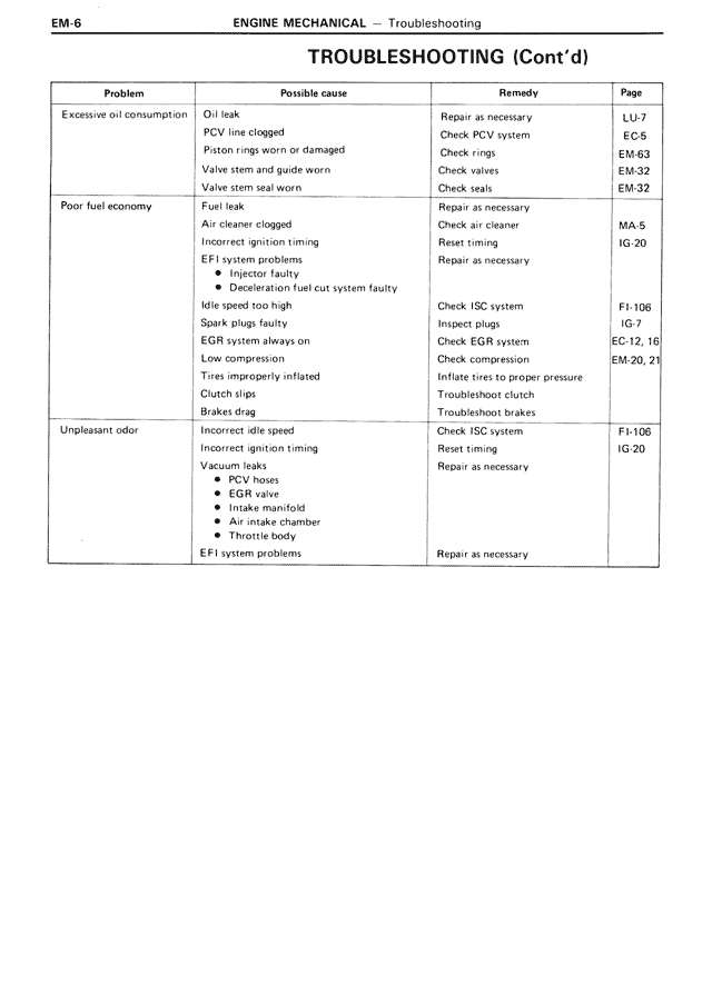 | Piston rings worn or damaged | Check rings | EM-63