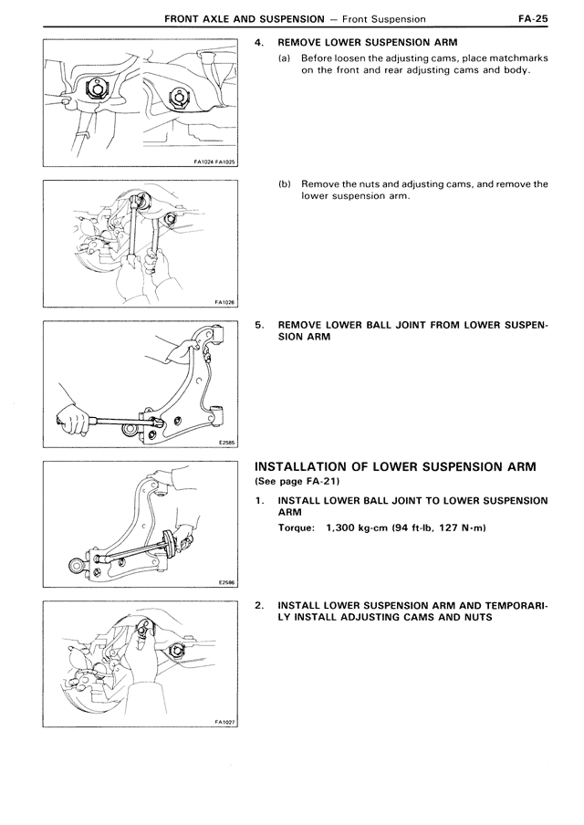 (b) Remove the nuts and adjusting cams, and remove the lower suspension arm.