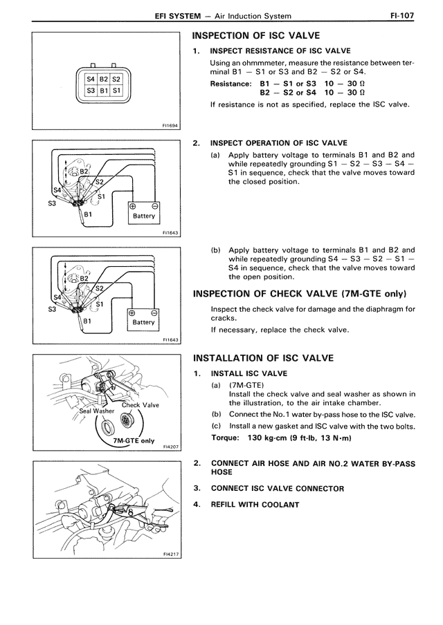 (a) Apply battery voltage to terminals B1 and B2 and while repeatedly grounding S1 — S2 — S3 — S4 — S1 in sequence, check that the valve moves toward the closed position.