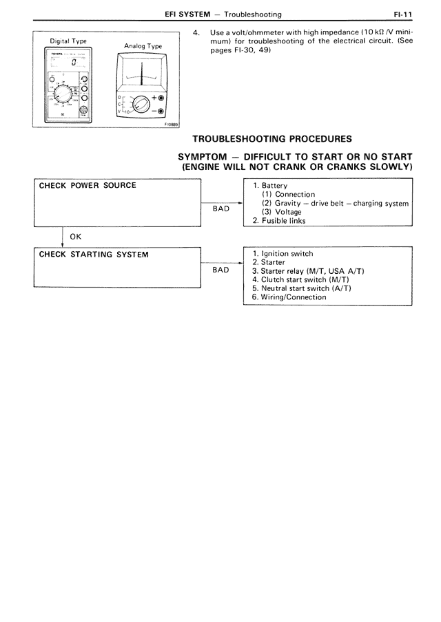 4. Use a volt/ohmmeter with high impedance (10 kΩ V mini-mum) for troubleshooting of the electrical circuit. (See pages FI-30, 49)