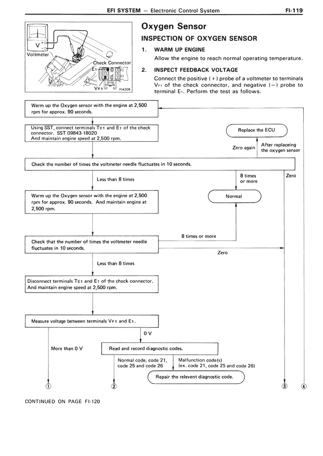Less than 8 times → Warm up the Oxygen sensor with the engine at 2,500 rpm for approx. 90 seconds. And maintain engine at 2,500 rpm. → Check that the number of times the voltmeter needle fluctuates in 10 seconds. → Less than 8 times → Disconnect terminals T₊₁ and E₁ of the check connector. And maintain engine speed at 2,500 rpm. → Measure voltage between terminals V₊₁ and E₁. → 0 V / More than 0 V → Read and record diagnostic codes. → Normal code, code 21, code 25 and code 26 / Malfunction code(s) (ex. code 21, code 25 and code 26) → Repair the relevant diagnostic code.