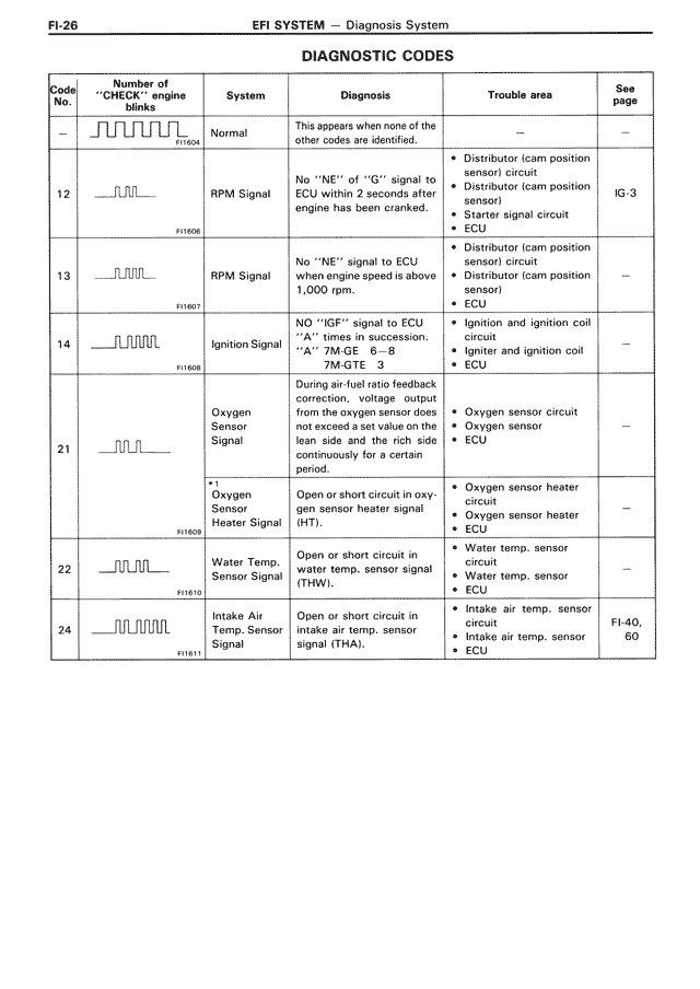 24 | __∩∩∩∩∩∩ | Intake Air Temp. Sensor Signal | Open or short circuit in intake air temp. sensor signal (THA). | • Intake air temp. sensor circuit