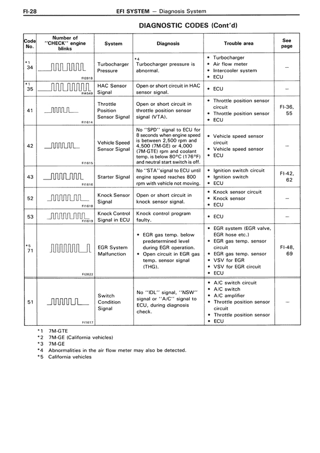 42 | _∏∏∏∏∏∏∏∏_ FI1615 | Vehicle Speed Sensor Signal | No "SPD" signal to ECU for 8 seconds when engine speed is above 2,000 (7M-GE), 1,500 (7M-GTE) rpm and coolant temp. is below 80°C (176°F) and neutral start switch is off. | • Vehicle speed sensor circuit • Vehicle speed sensor • ECU | —
