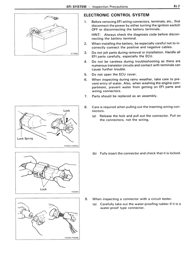 6. When inspecting during rainy weather, take care to prevent water from entering. Also, when washing the engine compartment, prevent water from getting on EFI parts and wiring connectors.