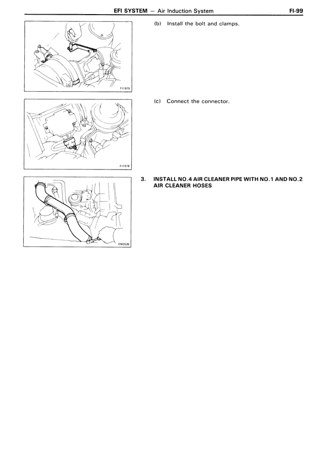 EFI SYSTEM — Air Induction System FI-99 (b) Install the bolt and clamps. (c) Connect the connector. 3. INSTALL NO.4 AIR CLEANER PIPE WITH NO.1 AND NO.2 AIR CLEANER HOSES