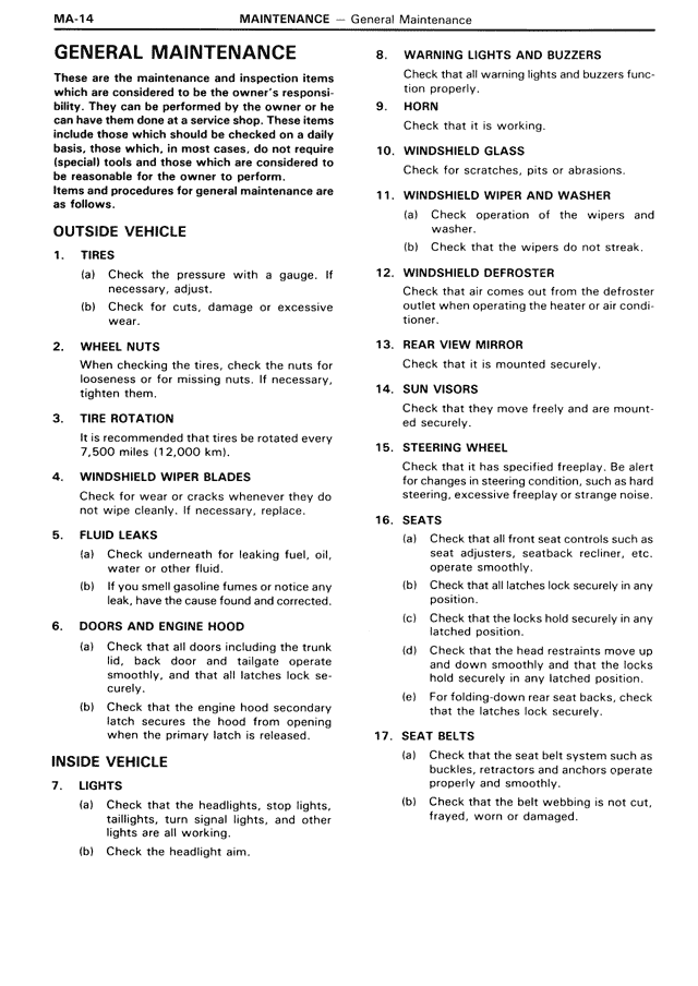 These are the maintenance and inspection items which are considered to be the owner's responsibility. They can be performed by the owner or he can have them done at a service station. They include those which should be checked on a daily basis, those which, in most cases, do not require (special) tools and those which are considered to be reasonable for the owner to perform.