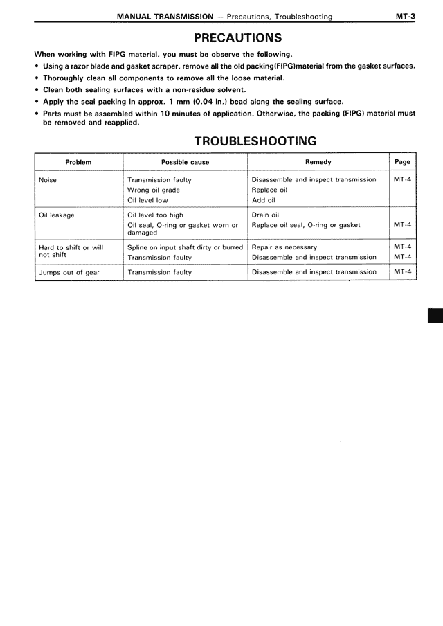 | Oil seal, O-ring or gasket worn or damaged | Replace oil seal, O-ring or gasket | MT-4