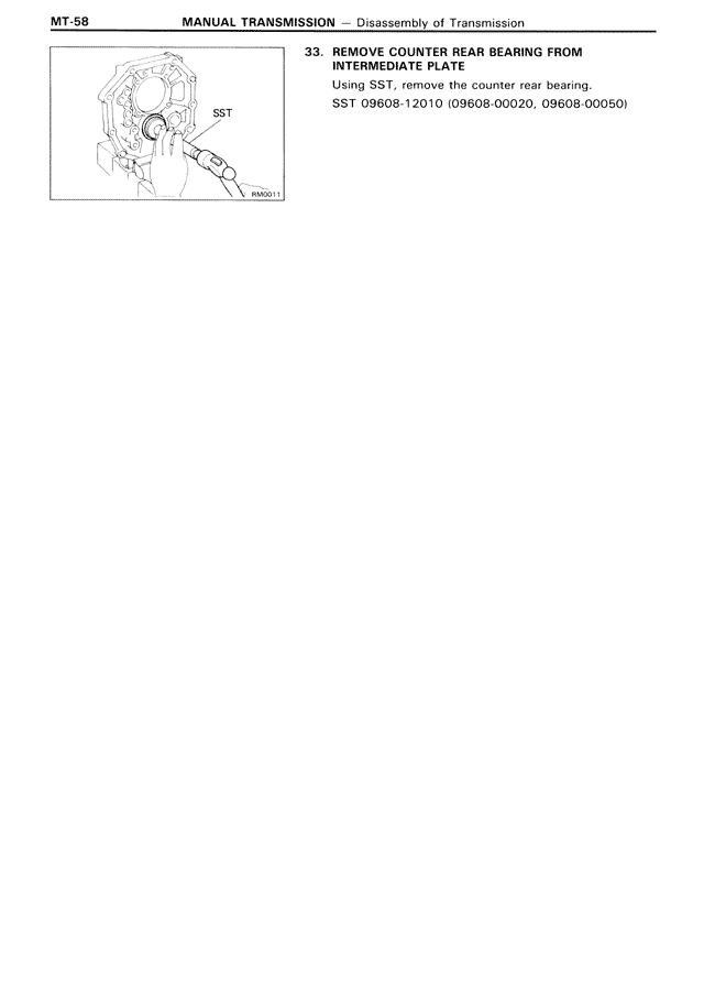 MT-58 MANUAL TRANSMISSION — Disassembly of Transmission 33. REMOVE COUNTER REAR BEARING FROM INTERMEDIATE PLATE Using SST, remove the counter rear bearing. SST 09608-12010 (09608-00020, 09608-00050) SST RN0011