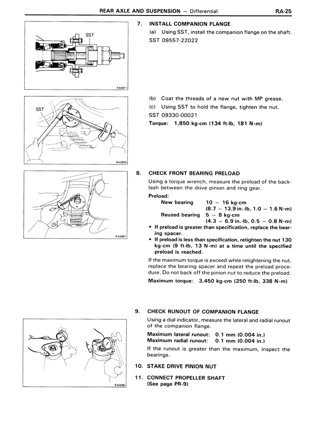If the maximum torque is exceed while retightening the nut, replace the bearing spacer and repeat the preload procedure. Do not back off the pinion nut to reduce the preload.