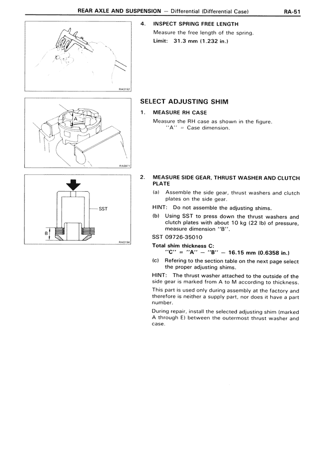 HINT: The thrust washer attached to the outside of the side gear is marked from A to M according to thickness. This part is used only during assembly at the factory and therefore is neither a supply part, nor does it have a part number.