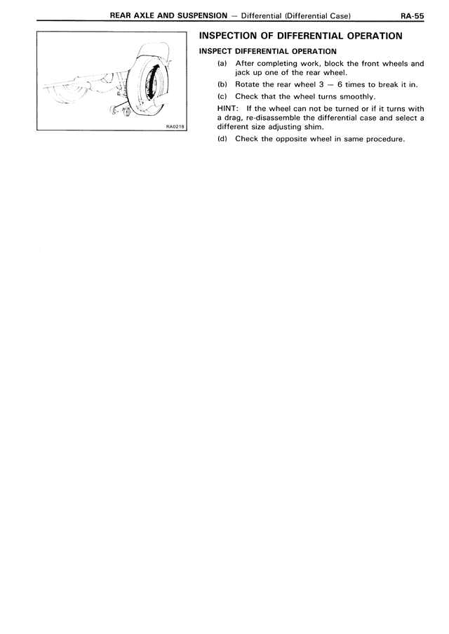HINT: If the wheel can not be turned or if it turns with a drag, re-disassemble the differential case and select a different size adjusting shim.