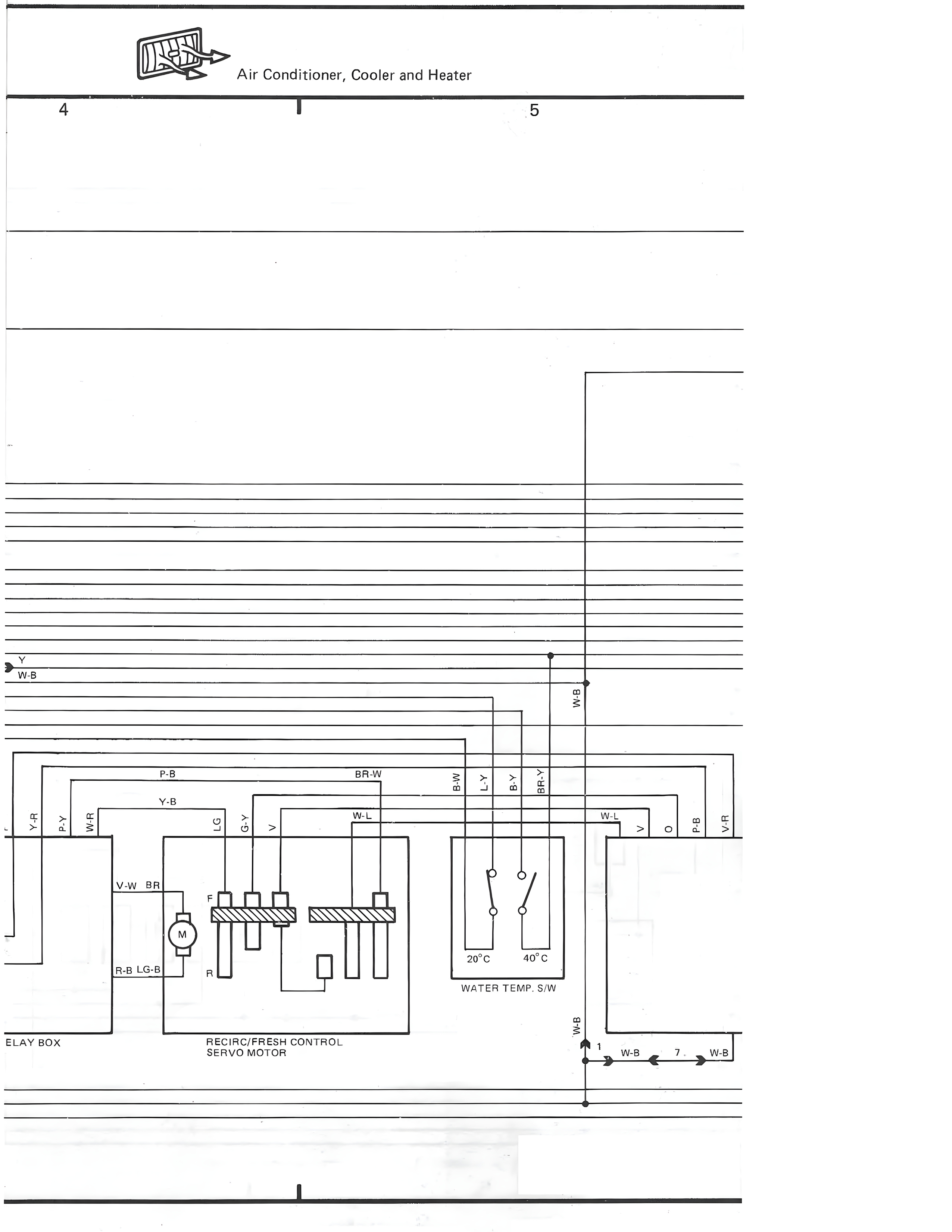 Air Conditioner, Cooler and Heater 4 5 Y W-B W-B P-B BR-W B-W L-Y B-Y BR-Y Y-B W-L W-L Y-R P-Y W-R LG G-Y V V O R-B R-R V-W BR M R-B LG-B P 20°C 40°C WATER TEMP. S/W W-B RELAY BOX RECIRC/FRESH CONTROL SERVO MOTOR W-B 1 7 W-B W-B