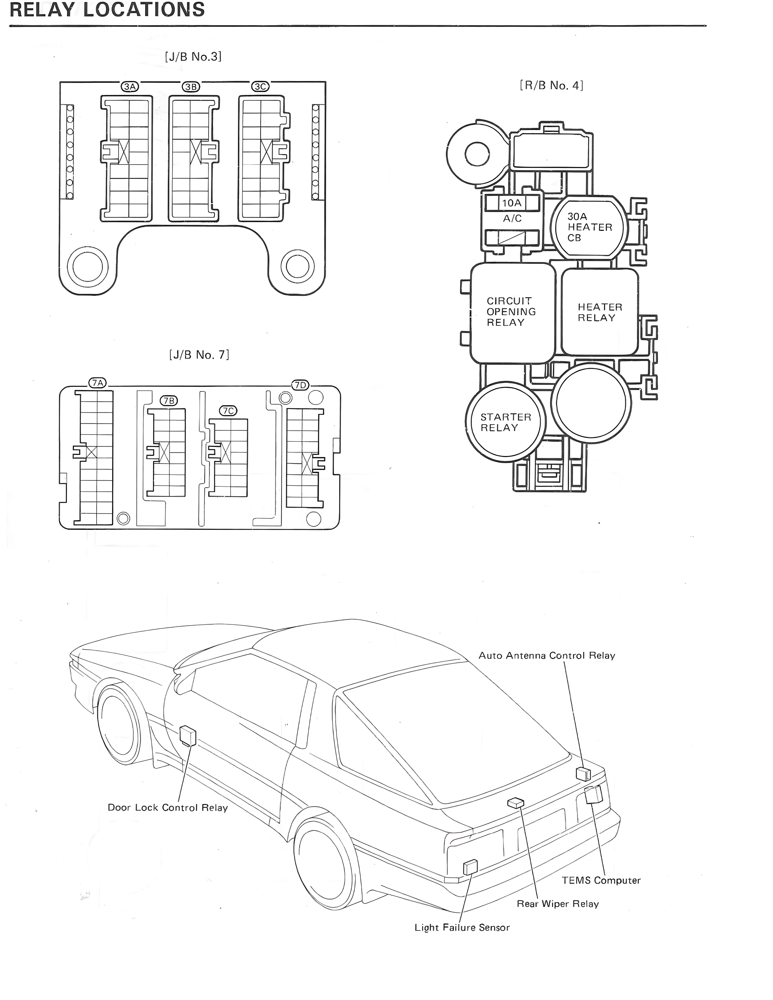 RELAY LOCATIONS [J/B No.3] 3A 3B 3C [R/B No. 4] 10A A/C 30A HEATER CB CIRCUIT OPENING RELAY HEATER RELAY [J/B No. 7] 7A 7B 7C 7D STARTER RELAY Auto Antenna Control Relay Door Lock Control Relay TEMS Computer Rear Wiper Relay Light Failure Sensor