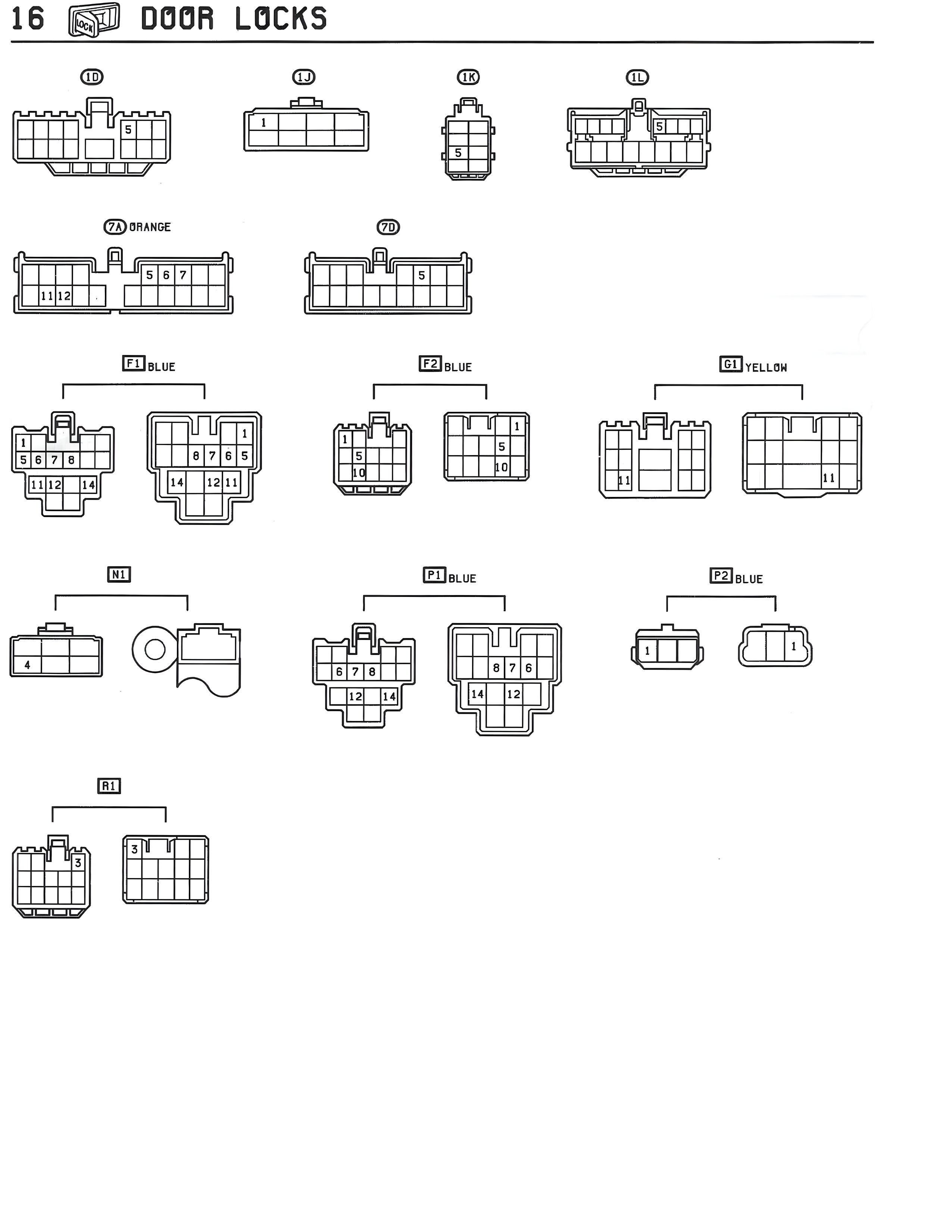 16 DOOR LOCKS ID IJ IK IL 7A ORANGE 7D F1 BLUE F2 BLUE G1 YELLOW 5 6 7 8 11 12 14 8 7 6 5 14 12 11 S 10 S 1 N1 P1 BLUE P2 BLUE 4 6 7 8 12 10 8 7 6 14 12 1 1 R1 3 1 3 N 1