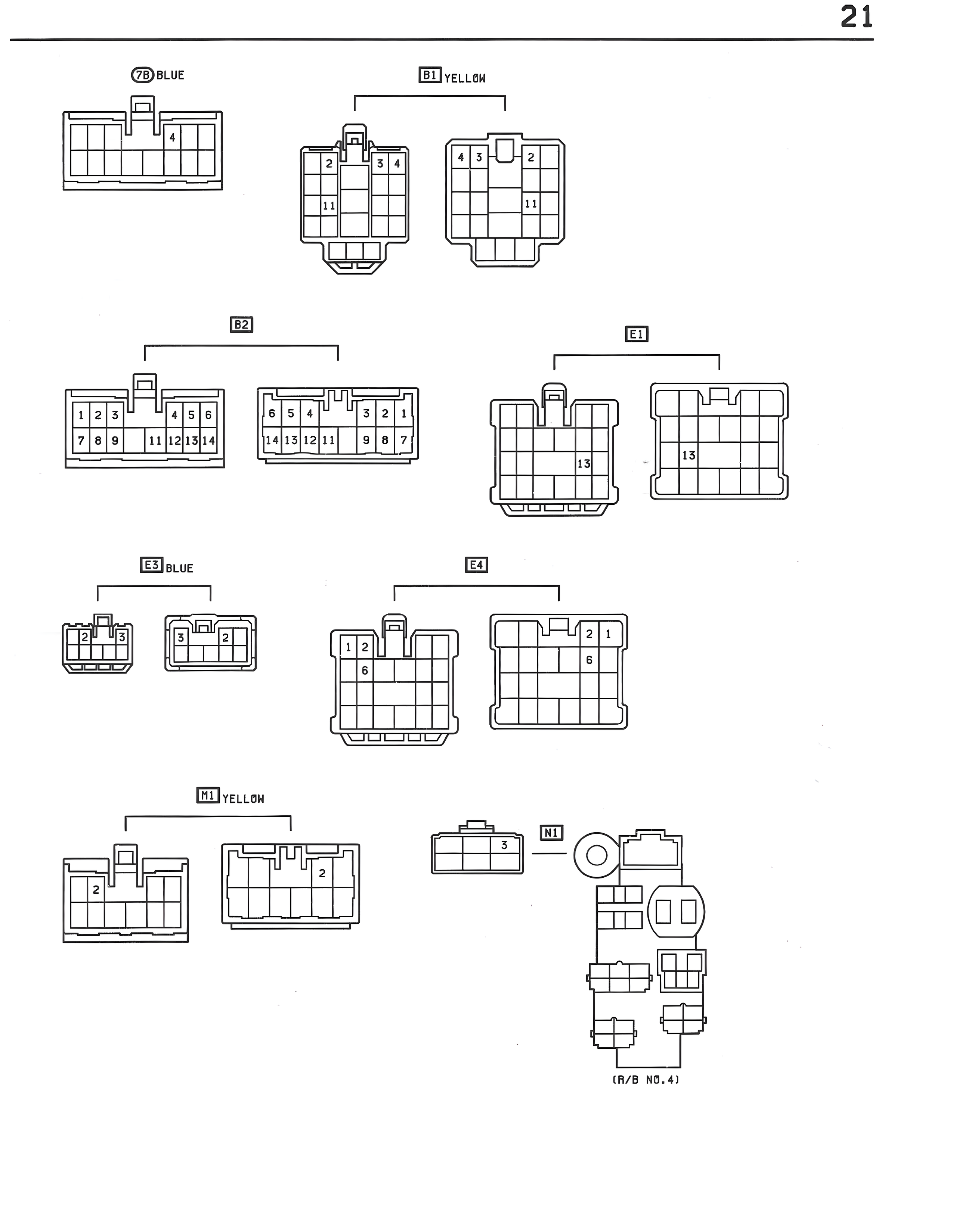 21 7B BLUE 4 B1 YELLOW 2 3 4 4 3 2 11 11 B2 1 2 3 4 5 6 7 8 9 11 12 13 14 1 5 4 3 2 14 13 12 11 9 8 7 E1 13 13 E3 BLUE 15 2 E4 1 2 6 1 2 6 H1 YELLOW 2 2 N1 3 (R/B NO.4)