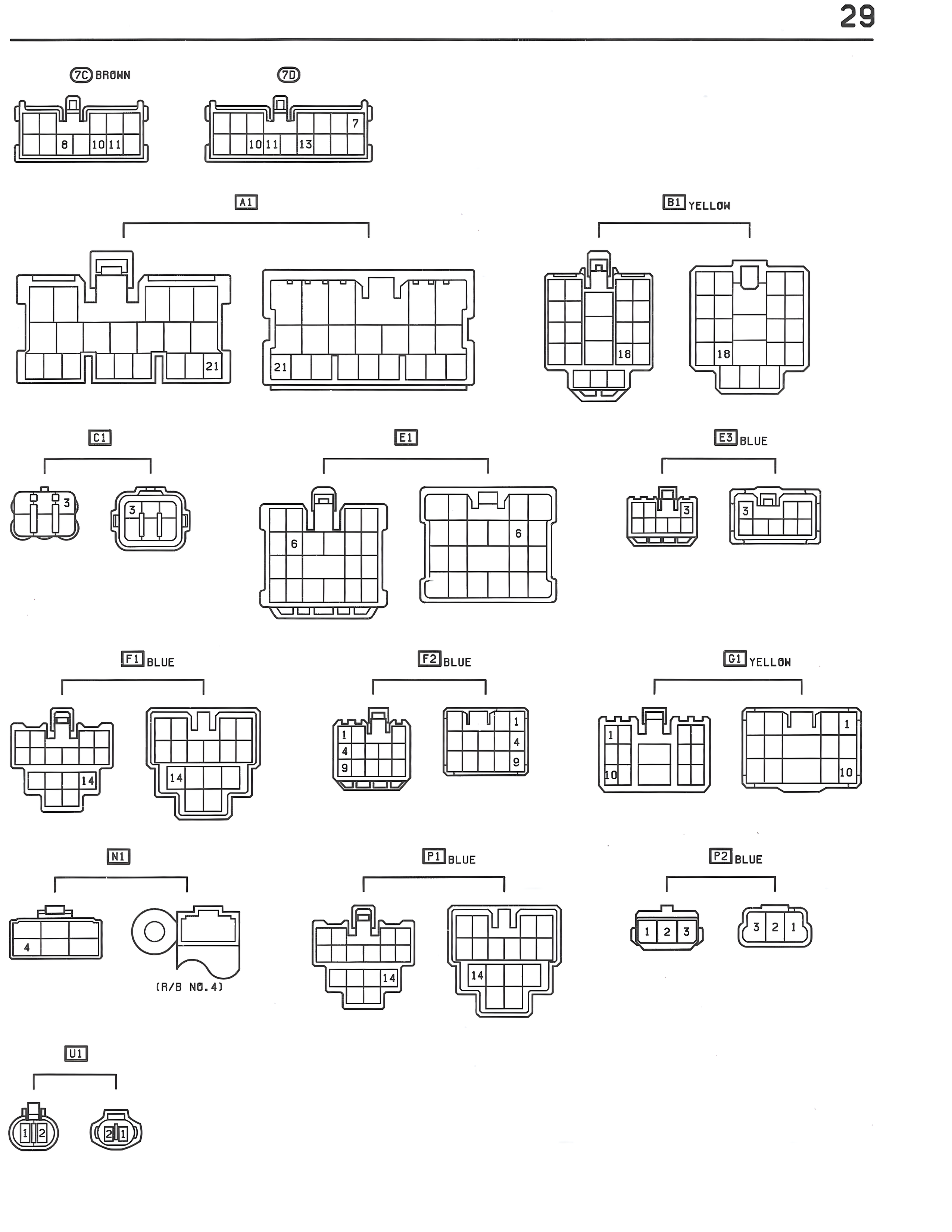 29 7C BROWN 6 10 11 7D 7 10 11 13 A1 21 21 B1 YELLOW 18 16 C1 2 3 5 E1 8 6 E5 BLUE 5 3 F1 BLUE 14 F2 BLUE 4 9 G1 YELLOW 1 10 10 N1 4 (R/B NO.4) P1 BLUE 14 14 P2 BLUE 1 2 3 2 2 1 U1 1 2 2 1