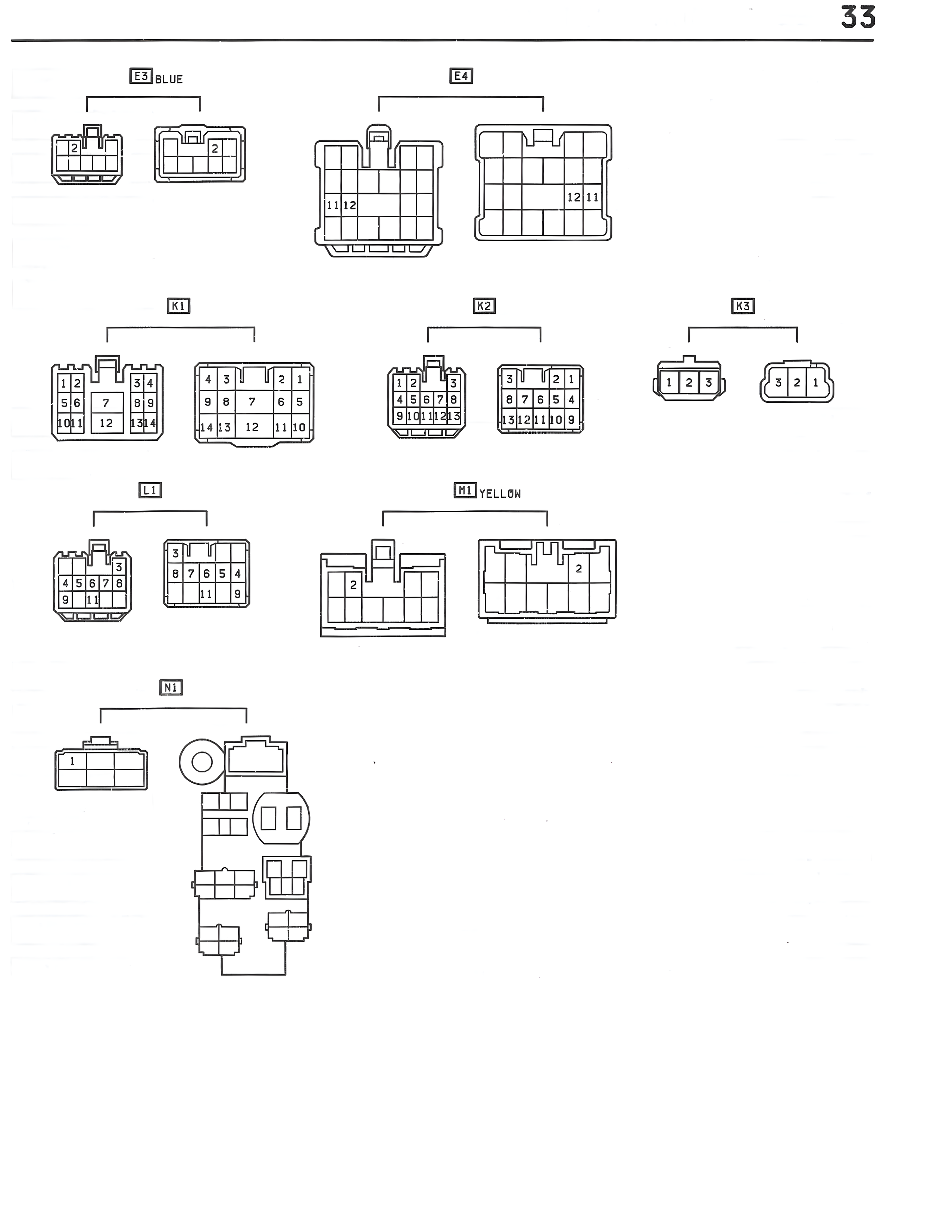 33 E3 BLUE 2 1 2 1 E4 1 2 12 11 K1 1 2 5 6 10 11 7 12 8 9 13 14 4 3 1 2 1 9 8 7 6 5 14 15 12 11 10 K2 1 2 4 5 6 7 8 9 10 11 12 13 3 3 1 2 1 8 7 6 5 4 13 12 11 10 9 K3 1 2 3 3 2 1 L1 1 2 3 4 5 6 7 8 9 11 1 3 1 8 7 6 5 4 1 9 H1 YELLOW 2 2 N1 1