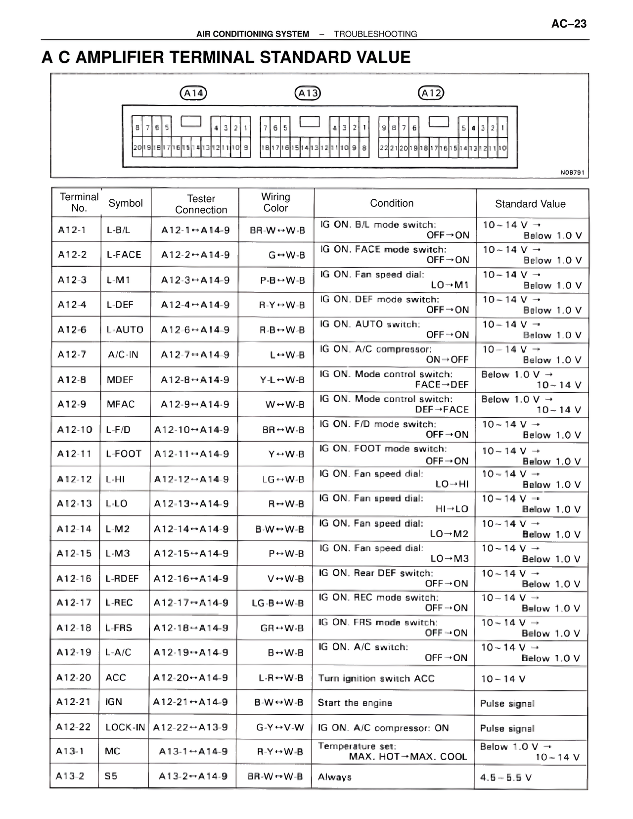 A12-7 | A/C-IN | A12-7↔A14-9 | L↔W-B | IG ON. A/C compressor: ON→OFF | 10~14 V → Below 1.0 V