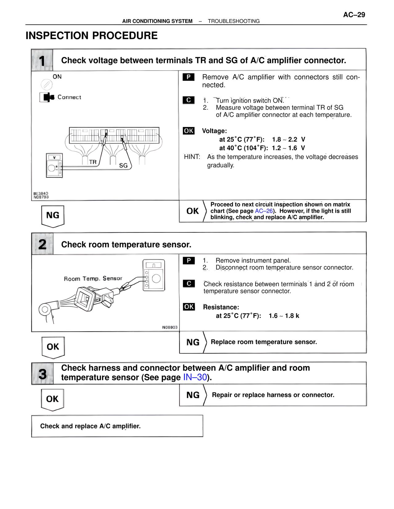 3 Check harness and connector between A/C amplifier and room temperature sensor (See page IN–30).