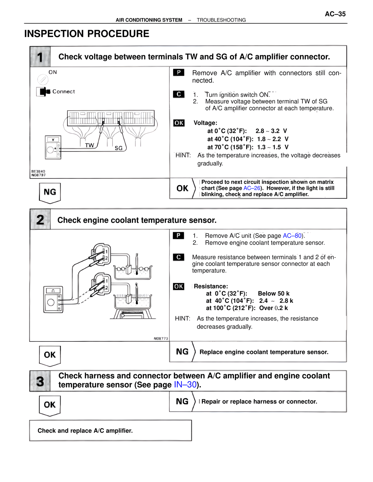 3 Check harness and connector between A/C amplifier and engine coolant temperature sensor (See page IN–30).