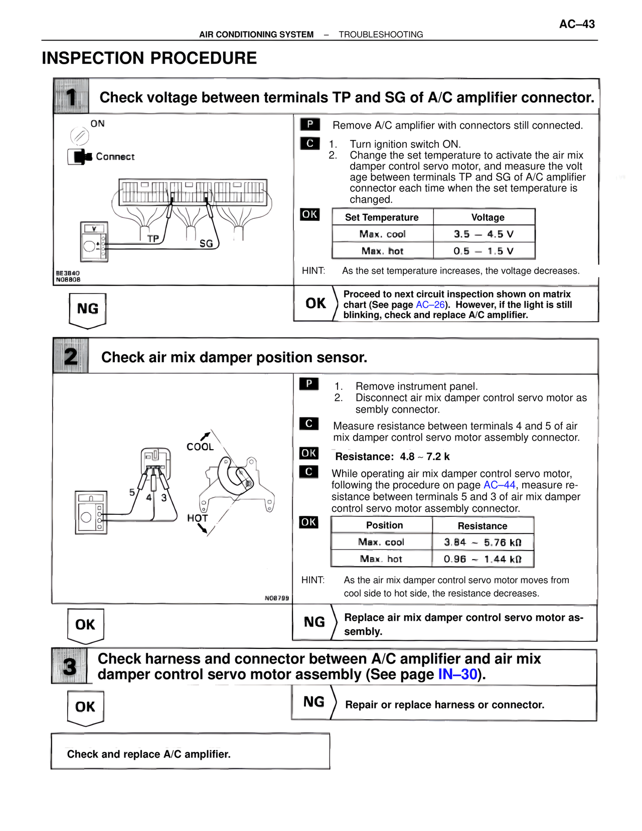 3 Check harness and connector between A/C amplifier and air mix damper control servo motor assembly (See page IN–30).
