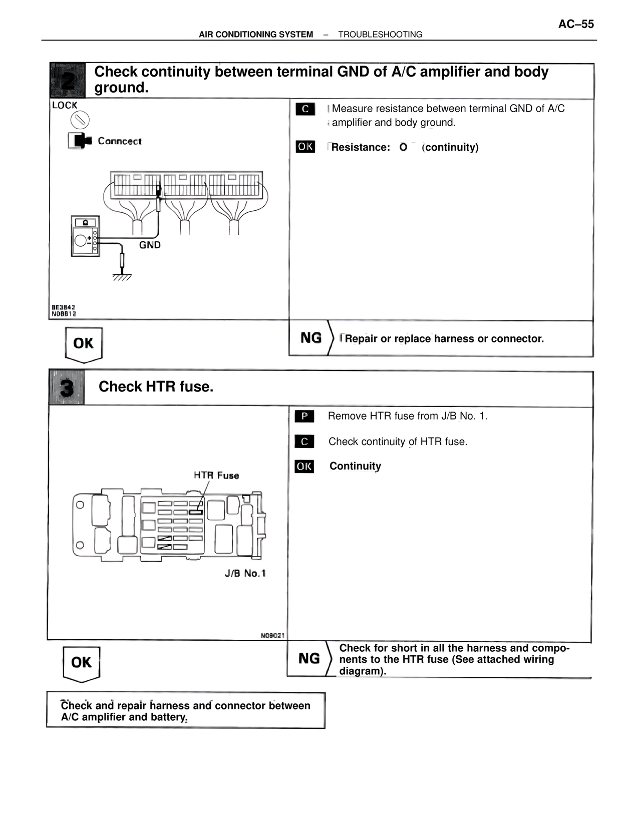 2 Check continuity between terminal GND of A/C amplifier and body ground.