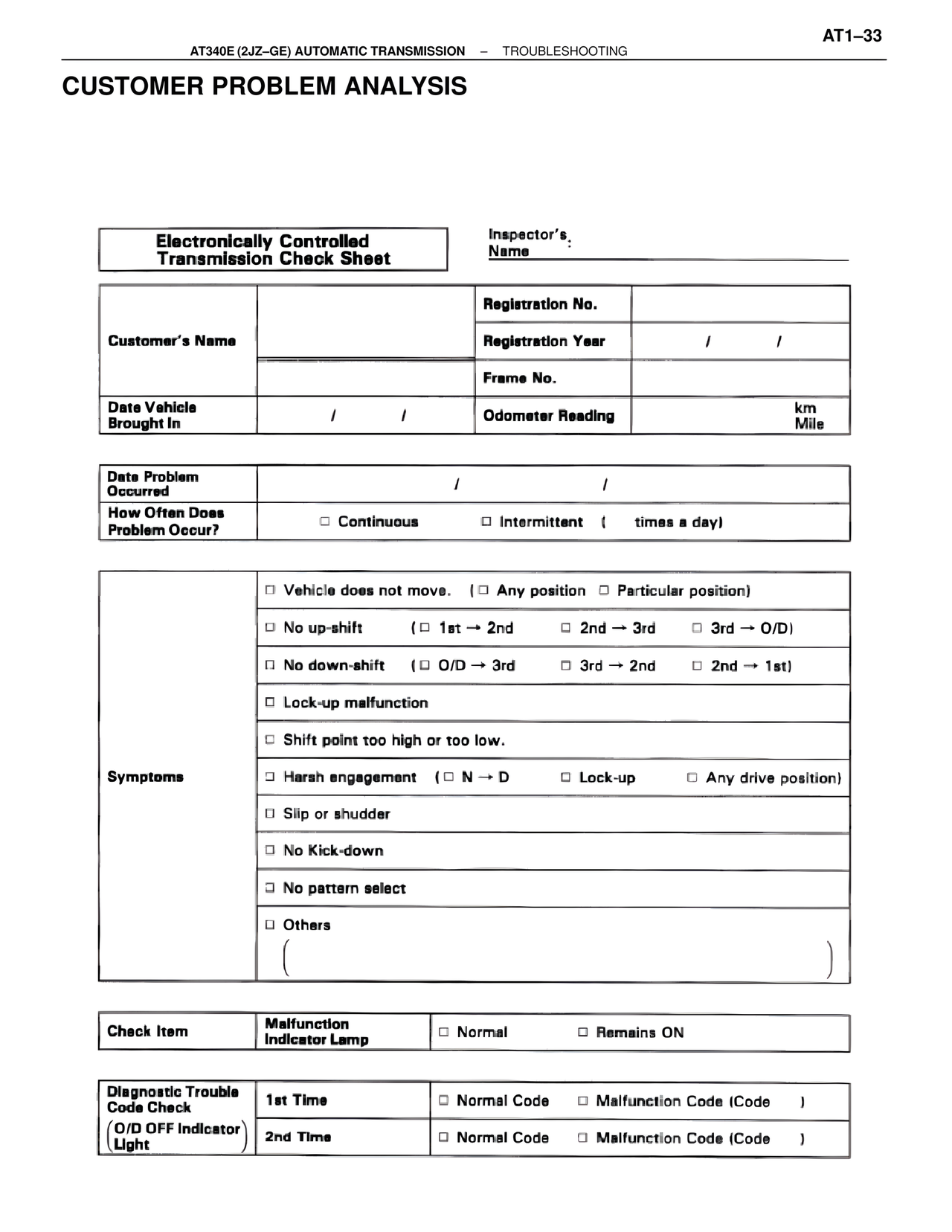 □ No up-shift (□ 1st → 2nd □ 2nd → 3rd □ 3rd → O/D)