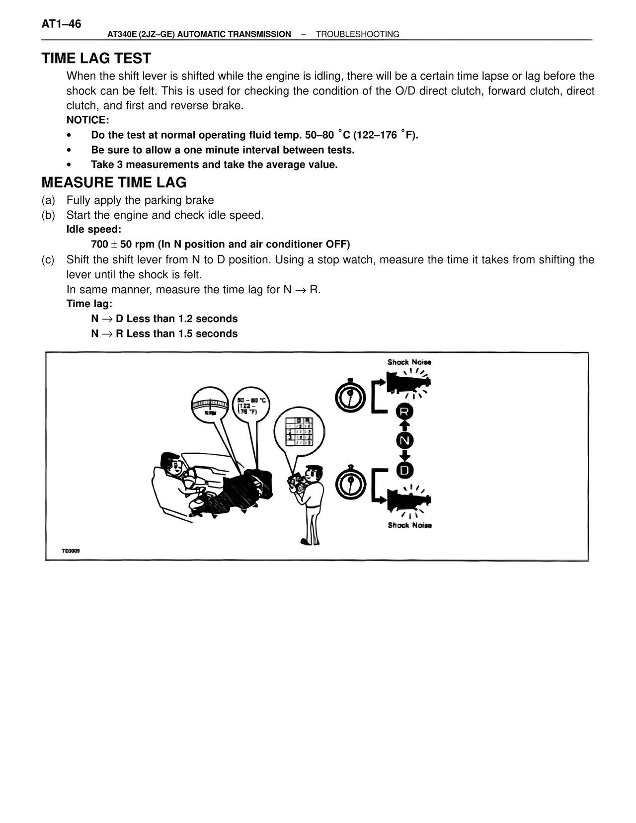 When the shift lever is shifted while the engine is idling, there will be a certain time lapse or lag before the shock can be felt. This is used for checking the condition of the O/D direct clutch, forward clutch, direct clutch, and first and reverse brake.