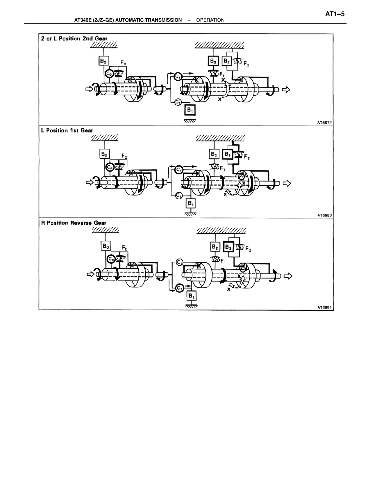 2 or L Position 2nd Gear B₀ F₀ C₀ B₂ B₃ F₂ C₁ F₁ C₂ C₃ B₁ AT6679 L Position 1st Gear B₀ F₀ C₀ B₂ B₃ F₂ C₁ F₁ C₂ C₃ B₁ AT6680 R Position Reverse Gear B₀ F₀ C₀ B₂ B₃ F₂ C F₁ C₃ B₁ AT6681