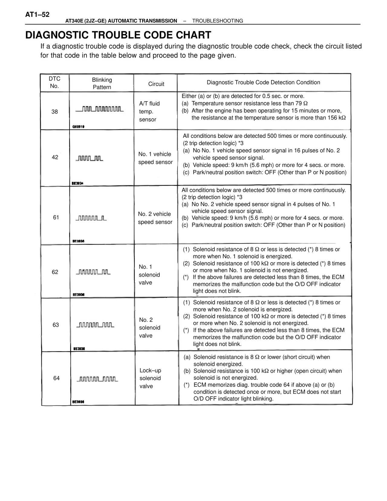 62 | [blinking pattern] | No. 1 solenoid valve | (1) Solenoid resistance of 8 Ω or less is detected (*) 8 times or more when No. 1 solenoid is energized.
