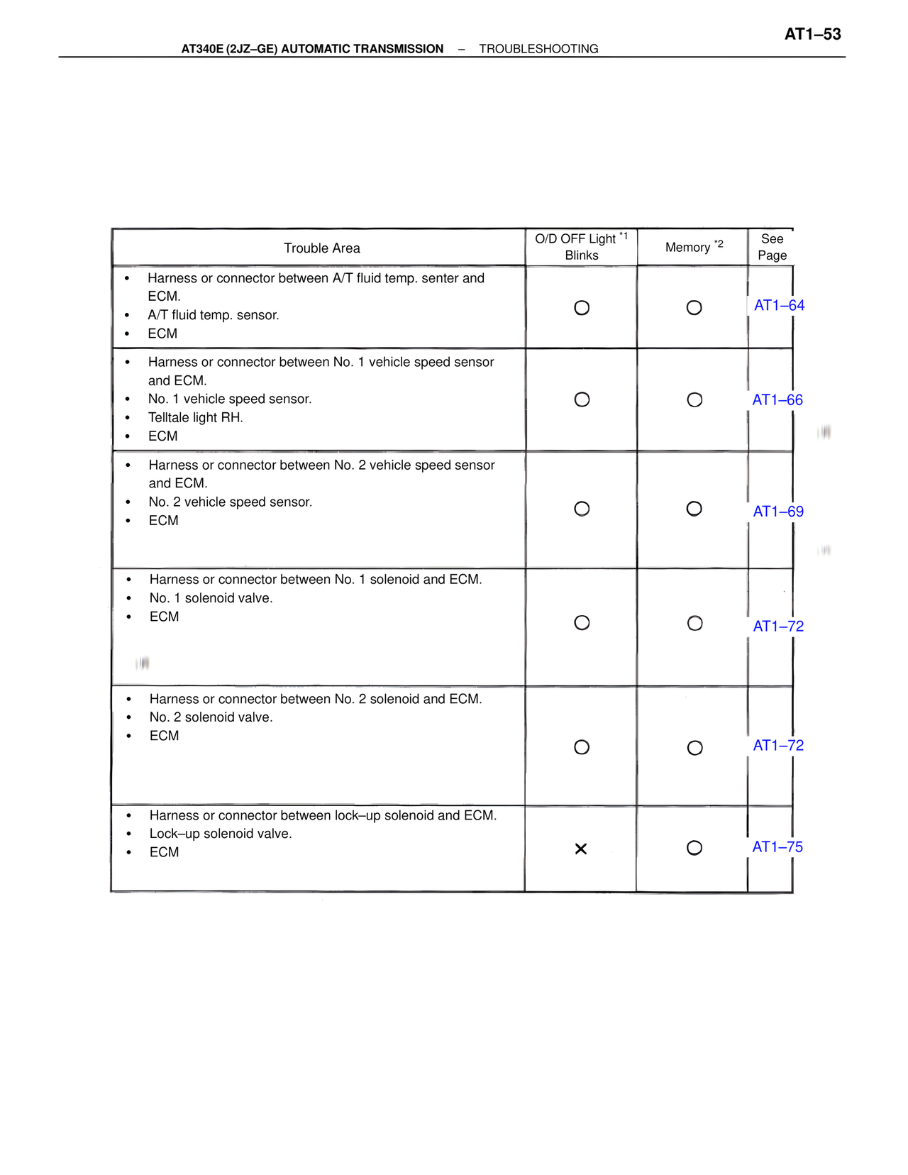 Trouble Area | O/D OFF Light *1 Blinks | Memory *2 | See Page
