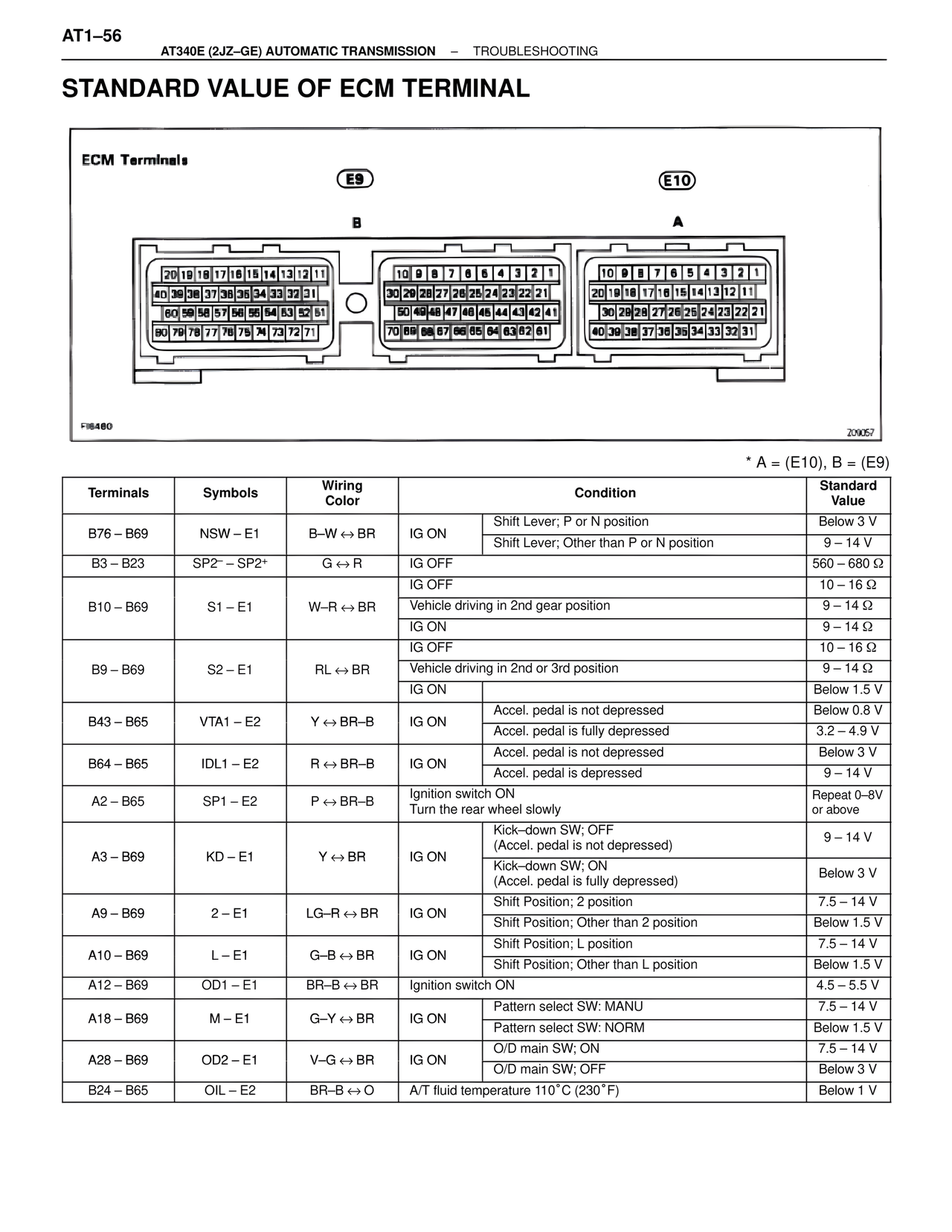B24 – B65 | OIL – E2 | BR–B ↔ O | A/T fluid temperature 110°C (230°F) | | Below 1 V