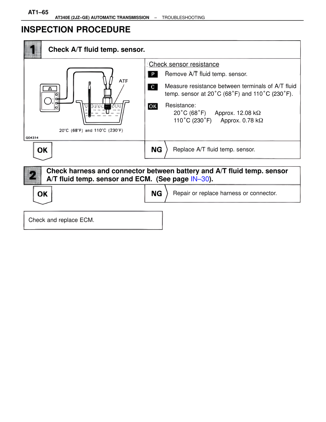 A/T fluid temp. sensor and ECM. (See page IN–30).