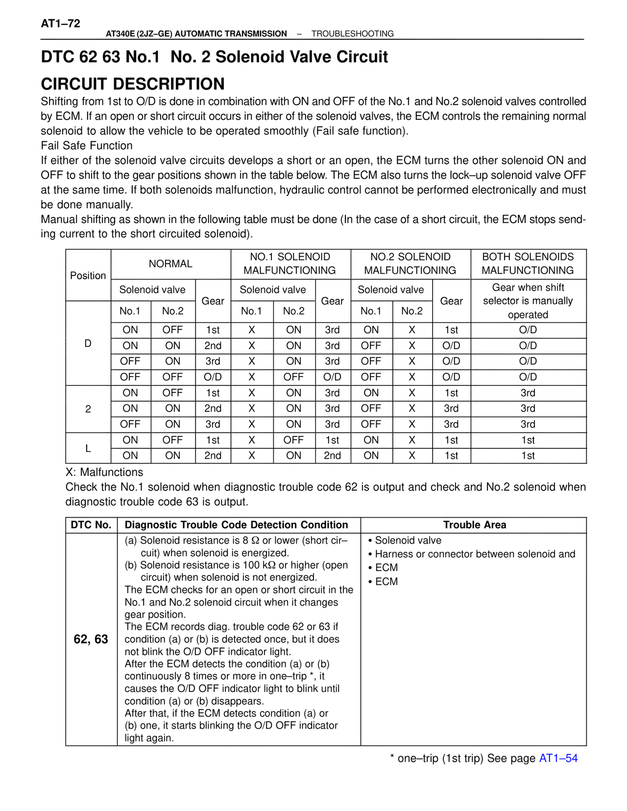 If either of the solenoid valve circuits develops a short or an open, the ECM turns the other solenoid ON and OFF to shift to the gear positions shown in the table below. The ECM also turns the lock–up solenoid valve OFF at the same time. If both solenoids malfunction, hydraulic control cannot be performed electronically and must be done manually.