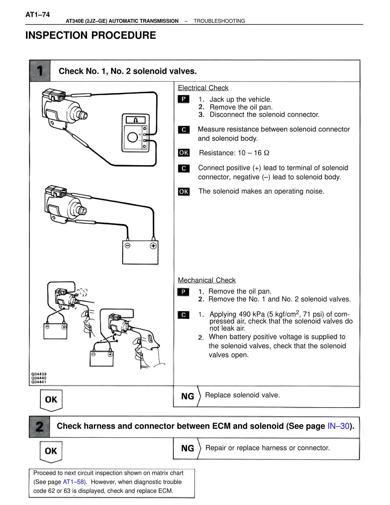 Proceed to next circuit inspection shown on matrix chart (See page AT1–58). However, when diagnostic trouble code 62 or 63 is displayed, check and replace ECM.