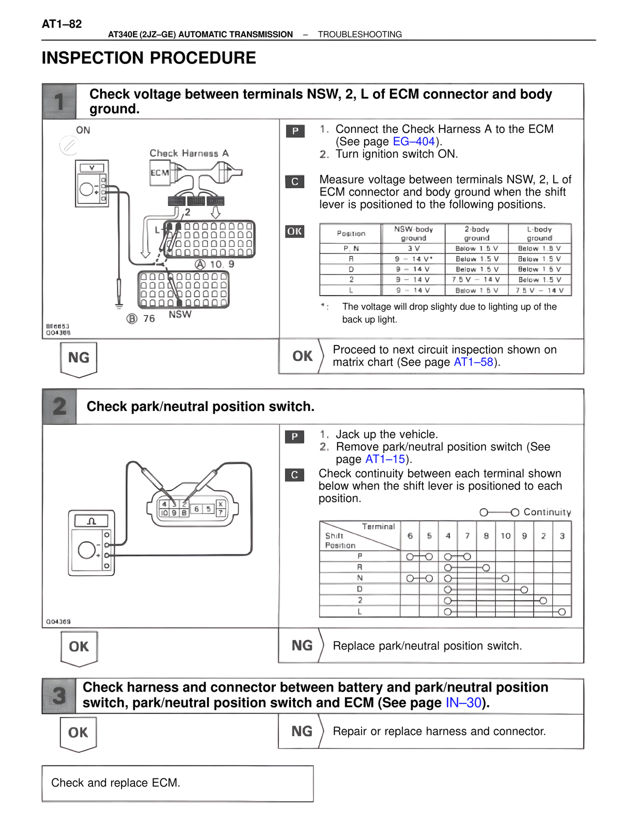 C Measure voltage between terminals NSW, 2, L of ECM connector and body ground when the shift lever is positioned to the following positions.