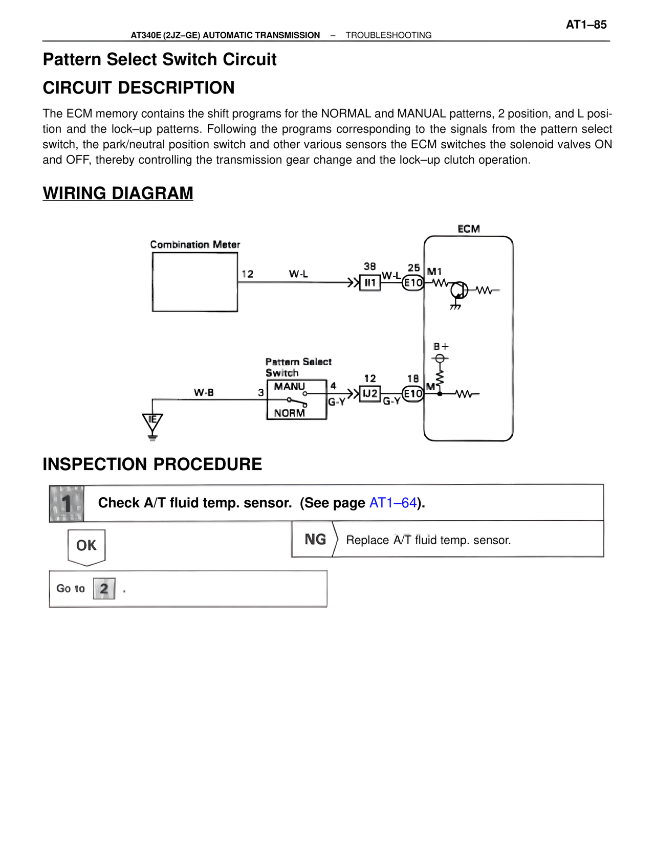 1 Check A/T fluid temp. sensor. (See page AT1–64).