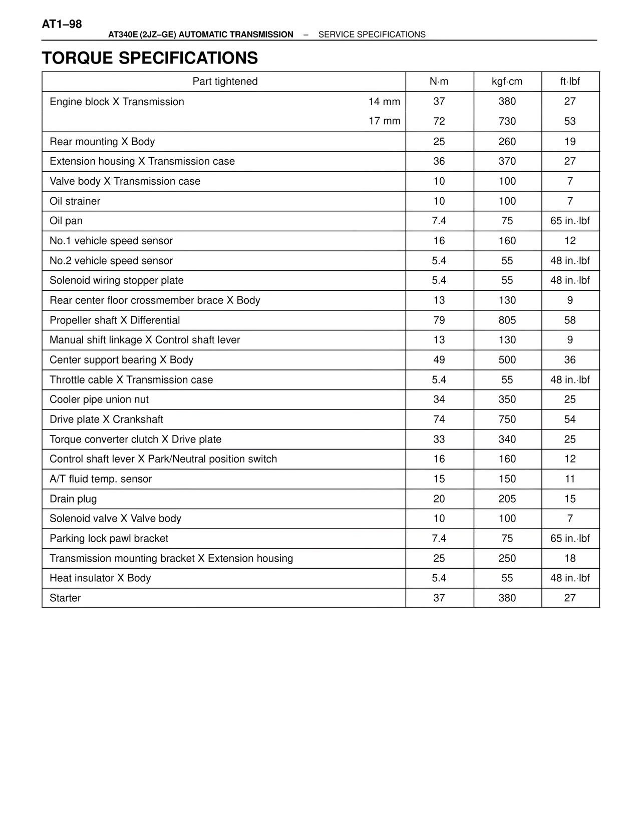AT340E (2JZ–GE) AUTOMATIC TRANSMISSION – SERVICE SPECIFICATIONS